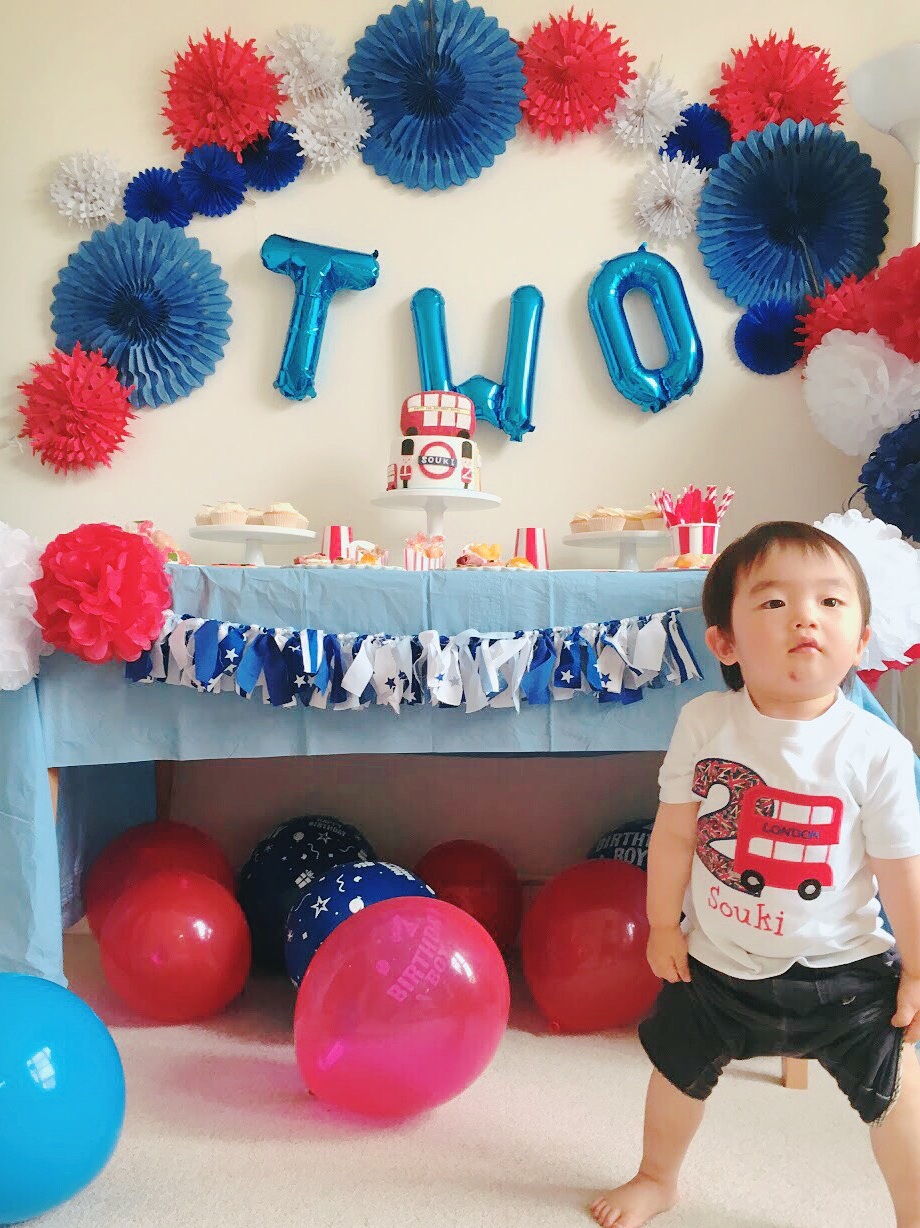 ロンドンで初めて企画したパーティーは、息子のための2歳の誕生会でした。渡英後半年もたたない頃で、住む国、職場、同僚、もう何もかもが違う環境の中で、毎日暮らすだけでも精一杯でしたから、パーティーの準備はそれはもう大変でした。けれど、このパーティーに関しては、やりたいテーマやテーマカラーがすぐ固まってくれました。せっかくきたのだから思いっきりブリティッシュにしよう!ということで、ユニオンジャックの三色がすぐに頭に浮かんだし、当時息子の大好きなものはロンドンバスでしたから。