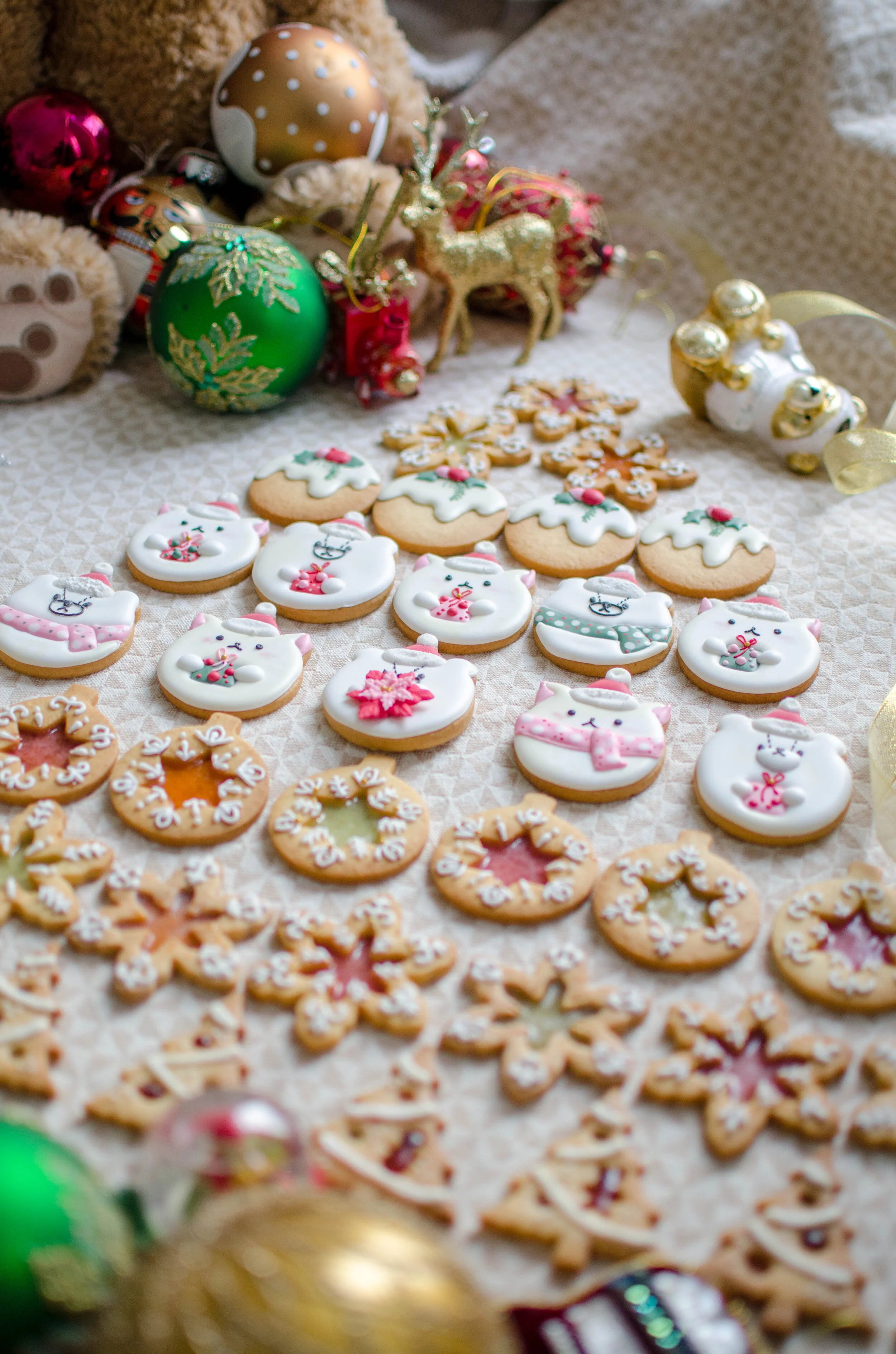 日本に住むお菓子作りを趣味とする方々にはおなじみの製菓用品メーカー、cottaさんのクリスマス・スタンプクッキー型をベースに、誰かへのプレゼントを大事に抱えたり、ホリデー気分のポップなマフラーをまいた森の動物たちをデザインしました。後でご紹介するステンドグラスクッキーでできたクリスマスツリーの森のなかを、ウキウキいそいそと、大切なだれかのところと足早に向かう様子をイメージしています。