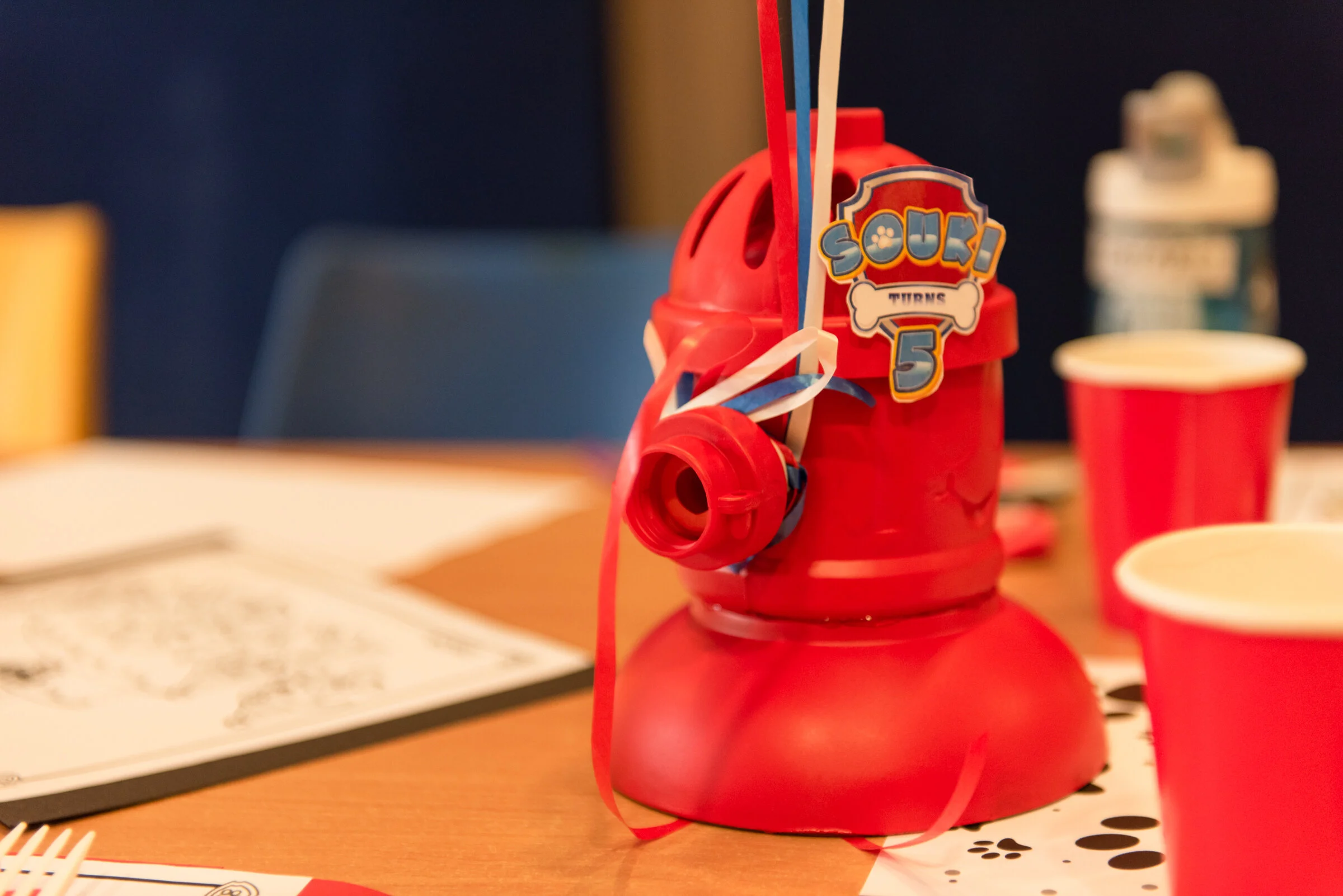 さて、クレヨン入りのエンブレム・カップの隣には・・・・実はこのパーティーで一番のお気に入りの作品!DIY消火栓が、ふわふわと浮かぶ風船をつかまえて座っています。