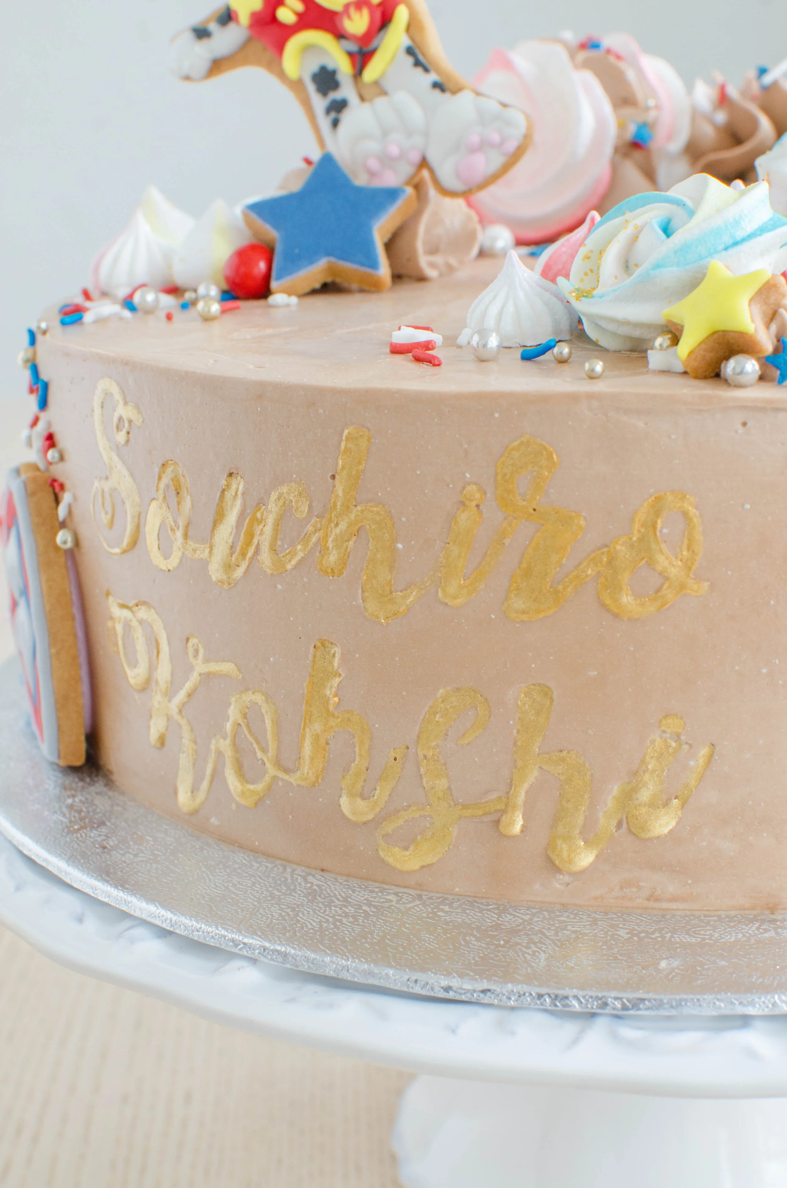 ケーキをぱっと見たときの印象が幼くなりすぎないよう、字体には少しエレガントなカーリーフォントを使ってバランスをとっています。