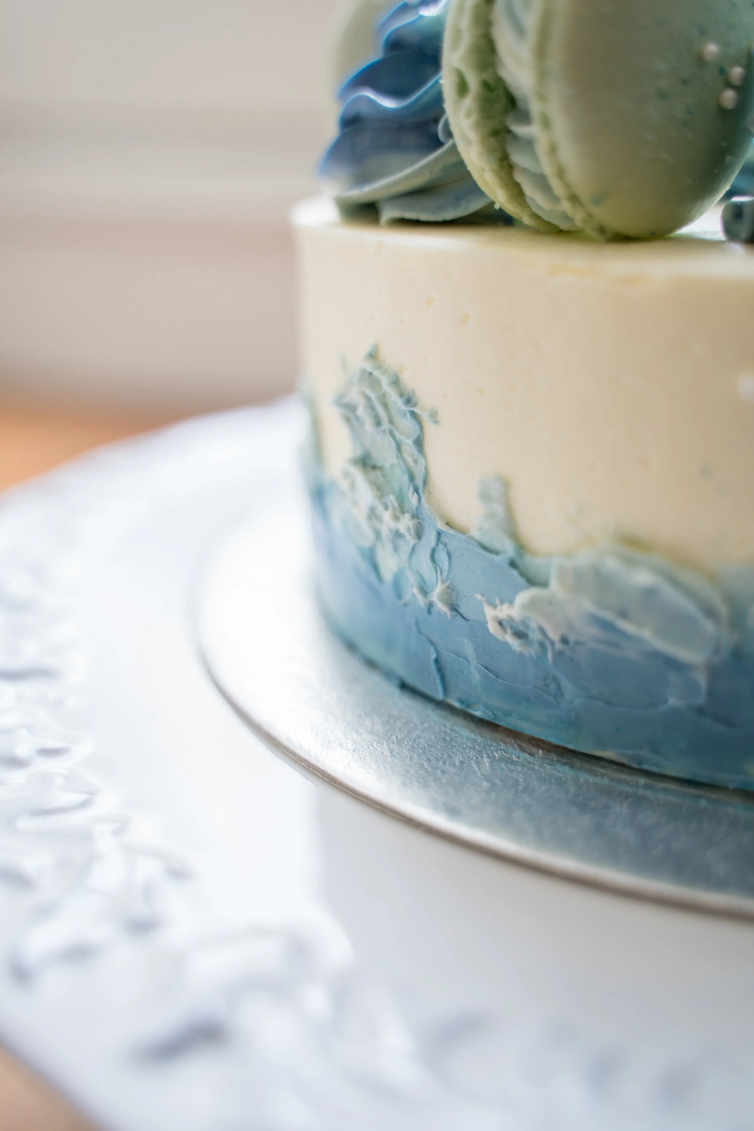 アイシングクッキーのケーキトッパーが引き立つように、ケーキトップのデザインは、CouCou Natsuhaのバタークリームケーキで定番のクラシックなものとしました。